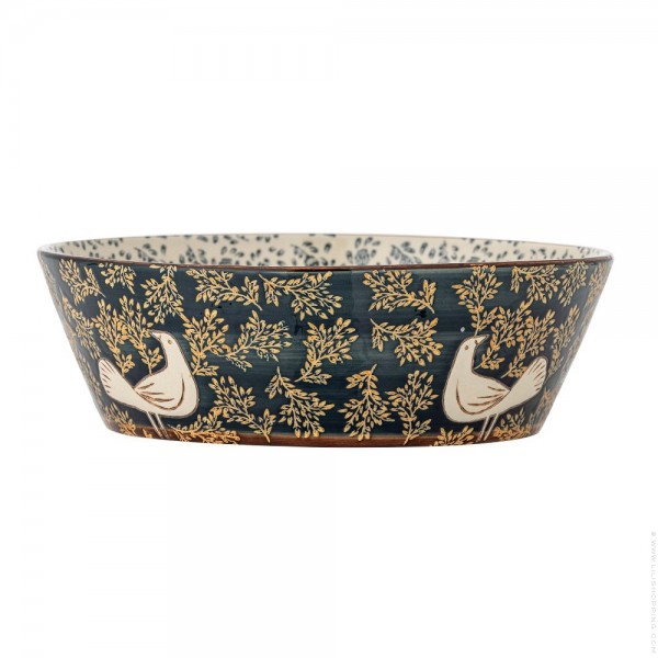 - This hand decorated tray impresses with its many details. It has an engraved design combined with a nice printed pattern of birds in warm colors. This bowl is perfect for serving or as a decorative object in the house.