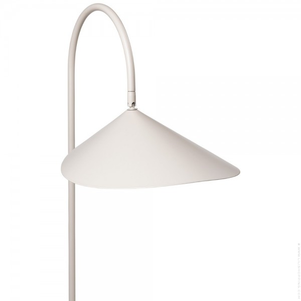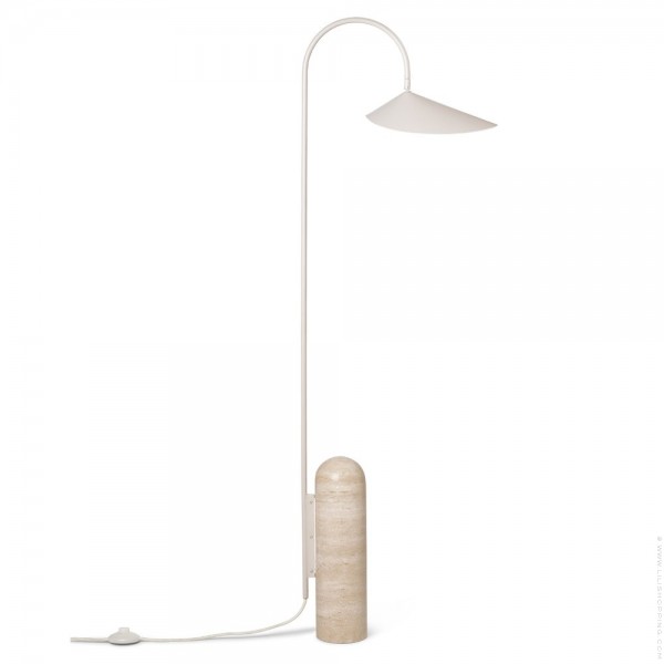 - This floor lamp is distinguished by its asymmetrical lampshade mounted on a thin metal rod and a travertine base. Ideal for lighting a dark corner or next to an armchair to read your favorite book, adjusting the lampshade at the perfect angle