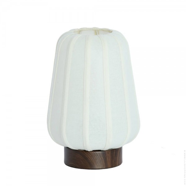 - Dive into a warm and welcoming atmosphere with this table lamp dressed in white canvas on a minimalist metal base imitating dark brown wood. The diffused light is soft and welcoming