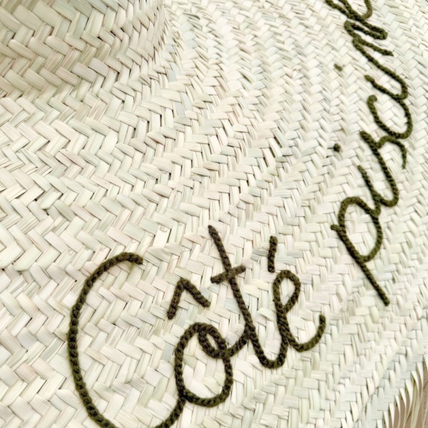 - Handcrafted, in braided palm leaf and embroidered with khaki-colored thread