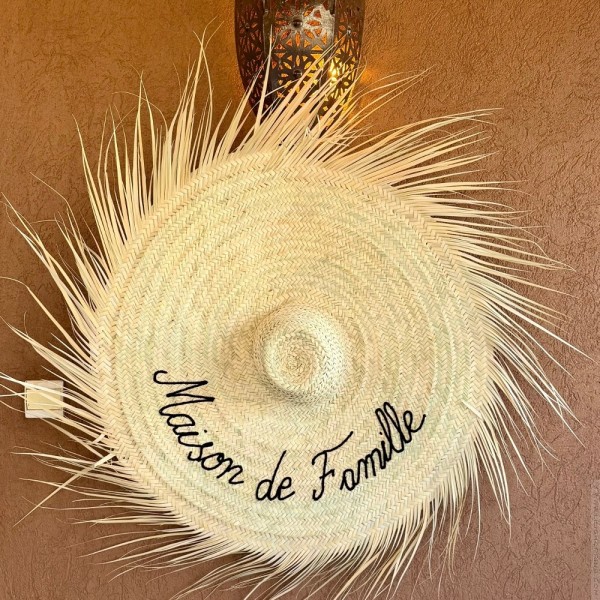 - Handcrafted, in braided palm leaf and embroidered with khaki-colored thread