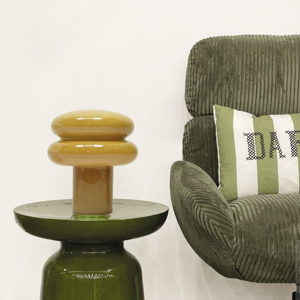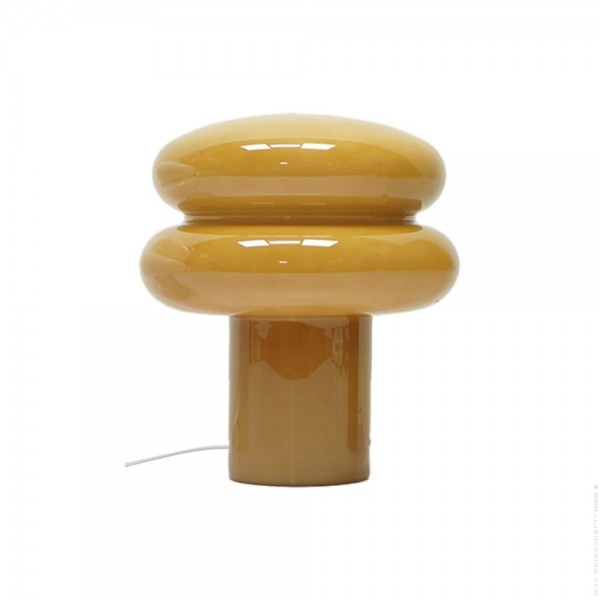 - Made of tinted glass, inspired by the Memphis movement, its playful design celebrates the joyful spirit of the 80s with its monochrome mushroom silhouette. Once lit, it reveals a subtle play of nuances that enliven its sculptural form