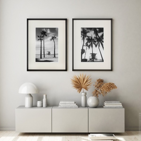- Framed art print under glass with white all-around pass and black straight baguette wood frame