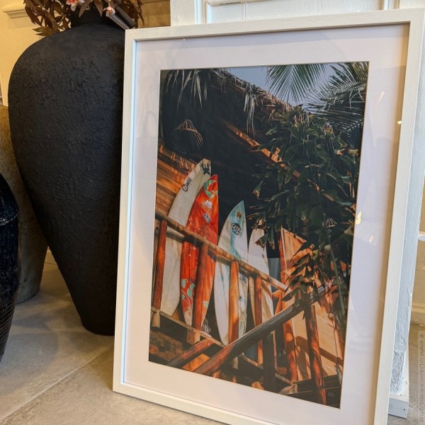 - Photo de Thao Courtial représentant quelques planches de surf colorées, adossées à une cabane en bois dans une ambiance de jungle au Mexique