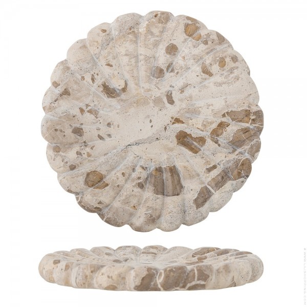 - Ce plateau est fabriqué en marbre et présente une forme douce et ronde avec des détails sculptés. La variation naturelle de la couleur et de la texture de la pierre rend chaque plateau unique et lui confère un aspect organique