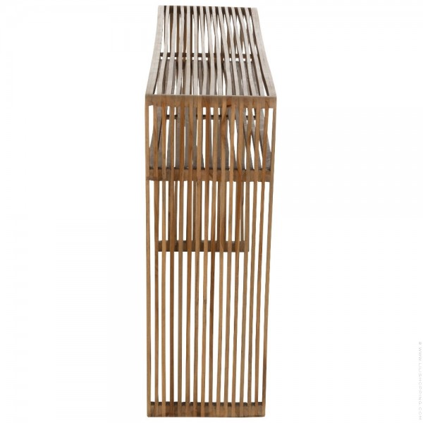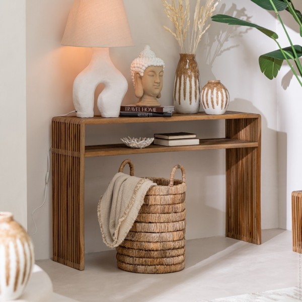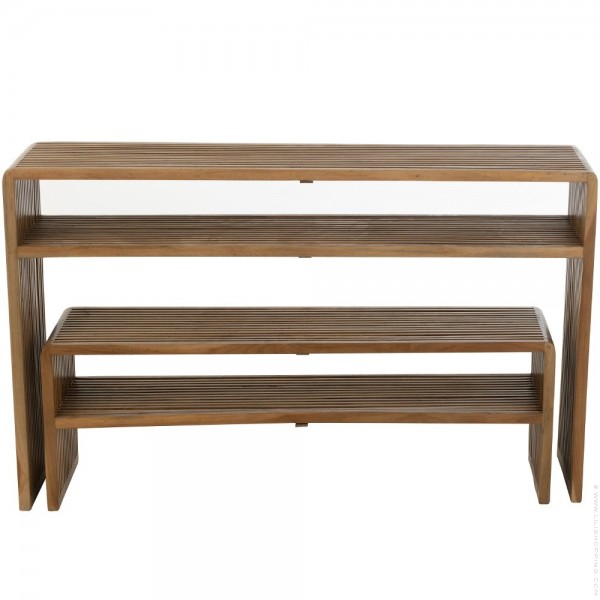 - La forme de cette console est épurée. Son étagère offre un espace ouvert de rangement. Il existe un modèle plus petit qui permet une association gigogne et autorise de nombreuses combinaisons.