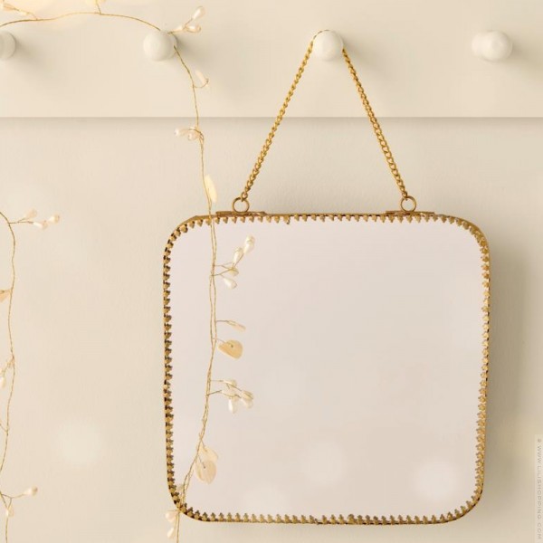 - Le cadre de ce miroir est en métal doré et son dos est en tissus velours noir. Il se suspend grâce à sa fine chaine assortie.