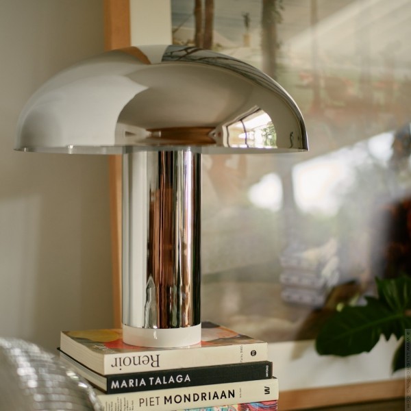 - Cette lampe de table allie fonctionnalité et esthétique à forte personnalité. La teinte ronde et chromée et la base cylindrique sont toutes deux éclairées. Ces éléments contrastants créent une esthétique originale et contemporaine.