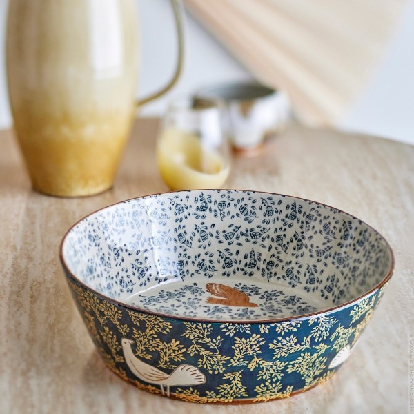 - Ce Saladier décoré à la main impressionne par ses nombreux détails. Il présente un design gravé combiné à un joli motif imprimé d'oiseaux dans des couleurs chaudes. Il est parfait pour le service ou comme objet décoratif dans la maison.