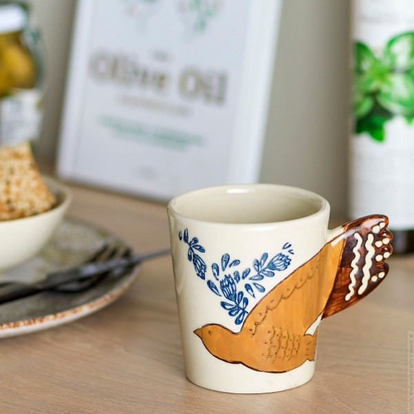- Cette Tasse présente un motif d'oiseau en relief, où l'aile sert de poignée. Utilisez-la pour votre café du matin ou comme élément décoratif dans votre maison. Le motif peint à la main rend chaque tasse unique