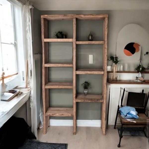 - Cette bibliothèque est réalisée de façon artisanale avec pièces anciennes de bois d'orme et de pin qui portent en elles leur histoire. Son caractère unique en fait un meuble remarquable dans votre intérieur. Les niches de tailles différentes autorisent une multitude d'options d'aménagements avec vos objets déco, lampes, livres, .. favoris